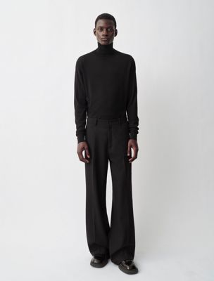 A high rise, wide leg trouser tailored in 100% heavy wool gabardine. Finished with pressed creases along the leg.
