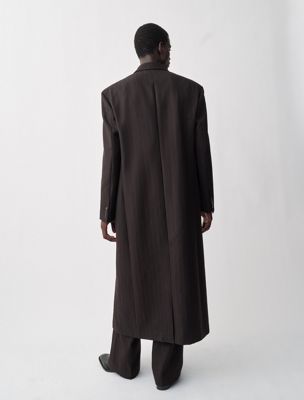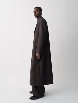 A single-breasted, three-button coat with notch lapels. Fully lined and crafted from 100% heavy compact wool with a textured pinstripe.