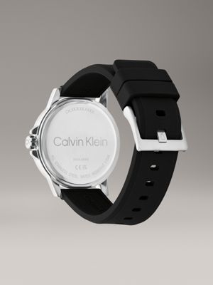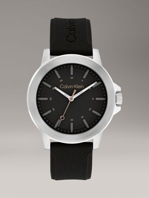 A distinct timepiece with sporty crown protection at the dial and a textured silicone strap. Made with an athletic-inspired dial and Calvin Klein logo details.