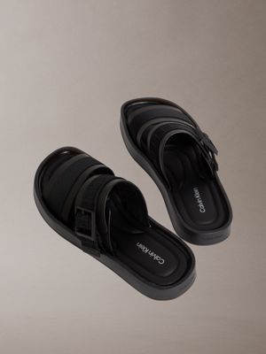 €119.90(inc. VAT)Modern and versatile, these black leather sandals feature monochrome jacquard webbing and a sleek square buckle for a clean, contemporary look. The ergonomic footbed supports natural movement, while the lightweight outsole offers relaxed, all-day comfort.