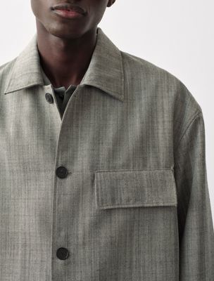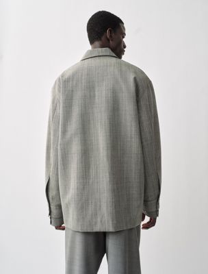 A relaxed, five-button, pajama-style shirt jacket. Designed with an elegant drape in 100% heavy mélange wool.