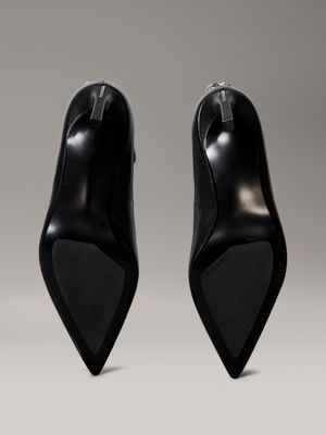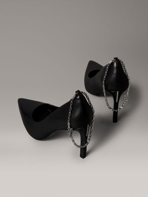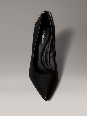 €159.90(inc. VAT)Designed to elevate any evening look, these sleek leather pumps feature a pointed toe and classic stiletto heel, wrapped in leather and accented with an engraved metal logo bar. A jewellery-inspired silver ankle chain adds a polished finish, while the cushioned memory foam footbed ensures comfort with every step.