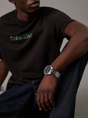 • Calvin Klein logo styling on the dial and clasp