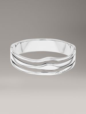 Sculpturale gelaagde vorm in gepolijst roestvrij staal. Deze armband heeft een scharniersluiting en is afgewerkt met een gegraveerd Calvin Klein-logo.