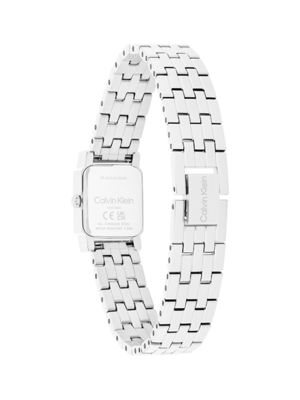 Dit op sieraden geïnspireerde CK Poise-horloge heeft een verfijnde vierkante kast met een versiering van kristallen, die het licht weerkaatsen bij elke beweging.